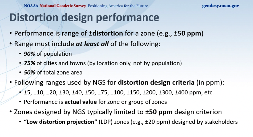 Dennis described NGS’s distortion design performance as seen in the image below. He explained that the performance is a range of +/- distortion for a zone, such as +/-50 ppm. The analysis involved determining parameters where the range includes 90% of the population, 75% of the cities and towns, and 50% of the total area. He highlighted those zones designed by NGS that where typically limited to +/- 50 ppm design criteria, but many low distortion projections (LDP) zones designed by stakeholders consisted of +/- 20 ppm design criteria.