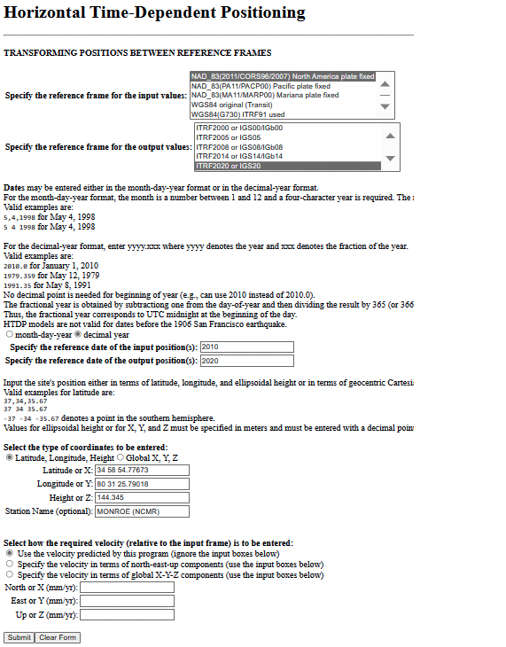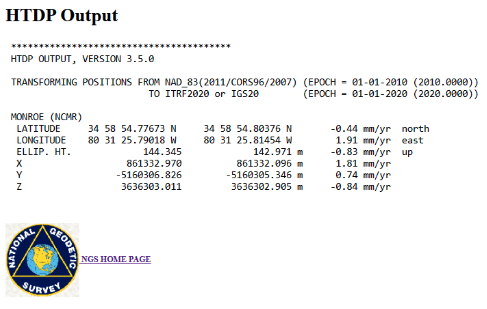Users can access HTDP here. I provided an example of HTDP for a CORS in North Carolina. I used the NAD 83 (2011) [epoch 2010.0] published coordinates of the CORS as my input values.