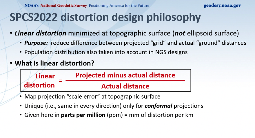 First, SPCS2022 has significantly more zones than the current SPCS83 zones. Second, SPCS83 map projections were designed to minimize linear distortion at ellipsoid surface, whereas the SPCS2022 map projections were designed to minimize linear distortion at topographic surface. The purpose being to reduce the difference between projected “grid” and “actual” ground distances.
