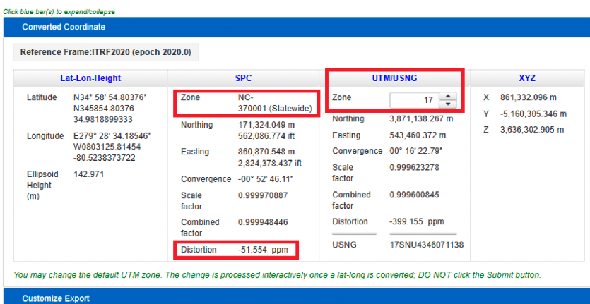 By clicking on the image below, users can obtain information for a point in a particular zone. The table provides northing and easting (meters and feet), scale factor, linear distortion, and convergence angle for a specific coordinate in a particular zone. It should be noted that all values that are provided in feet will be international feet units (ift).