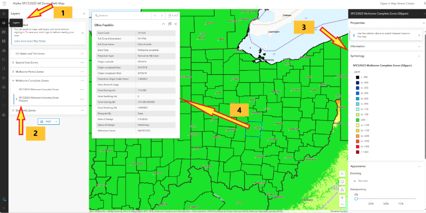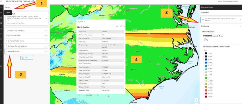 I zoomed down until I located North Carolina’s map zone. The web page provides access to various layers and information. First, if users move their curser over the layer button, a list of layers pops up. Next, select one of the layers, such as Statewide Zones, then the properties of the map are placed on the map. Finally, when readers click on the map itself, the information about the SPCS2022 zone appears on the map.