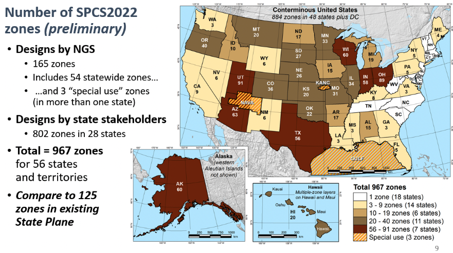 As usual, Michael Dennis of NGS did a great job of describing the new SPCS2022, and the differences between the State Plane Coordinate System of 1983 (SPCS83) and SPCS2022. I have included a few of his slides that highlight the SPCS2022.