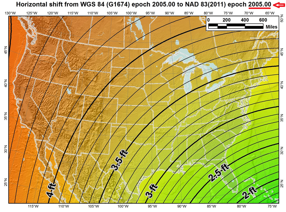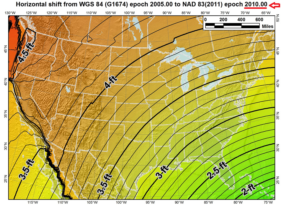 However, the correct US definition of NAD83/2011 is referenced to epoch 2010.0, a full five years later than the first image where it was referenced to 2005.0. Notice the dramatic effect of the tectonic plate movement in the western part of the US. In this case, the 14-parameter transformation was used as well as the velocity model to estimate the tectonic plate movement.