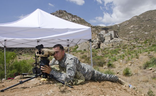Sgt. 1st Class Justin Rotti, a combat developer from the Training and Doctrine Command Fire Cell, Fires Center of Excellence, uses a developmental handheld precision targeting device during a test at White Sands Missile Range’s 500k test site. White Sands’ terrain and environmental features make it well suited for testing systems of this type. (Photo Credit: John Andrew Hamilton, ATEC)