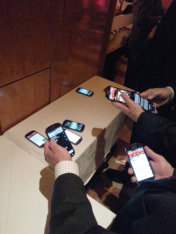 Event participants pick up Samsung phones equipped with the Bellagio app.