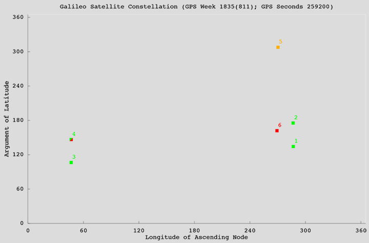 The locations of the satellites in the Galileo constellation are shown in the accompanying figure. Satellites in green are transmitting a full complement of L-band signals. Galileo 4 (GSAT0104), one of the in-orbit validation satellites, suffered a power anomaly and only transmits on the E1 frequency. Galileo 5 is transmitting L-band signals but its orbit cannot be properly represented in the Galileo broadcast almanac. Galileo 6 has not started transmitting valid L-band signals yet.