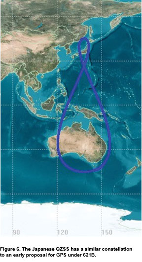 This proposed constellation design was a reasonable compromise, given the boundary conditions of a four-satellite demonstration and absolutely minimal cost. It is interesting that the Japanese, with a requirement to supplement GPS with satellite signals to improve coverage in urban areas (where there are high shading angles), have designed a very similar constellation. The Japanese configuration is intended to improve coverage restricted to their longitudinal sector of the globe. The new system is called Quasi-Zenith Satellite System (QZSS), and the Japanese appear to be well on the way to fielding it.