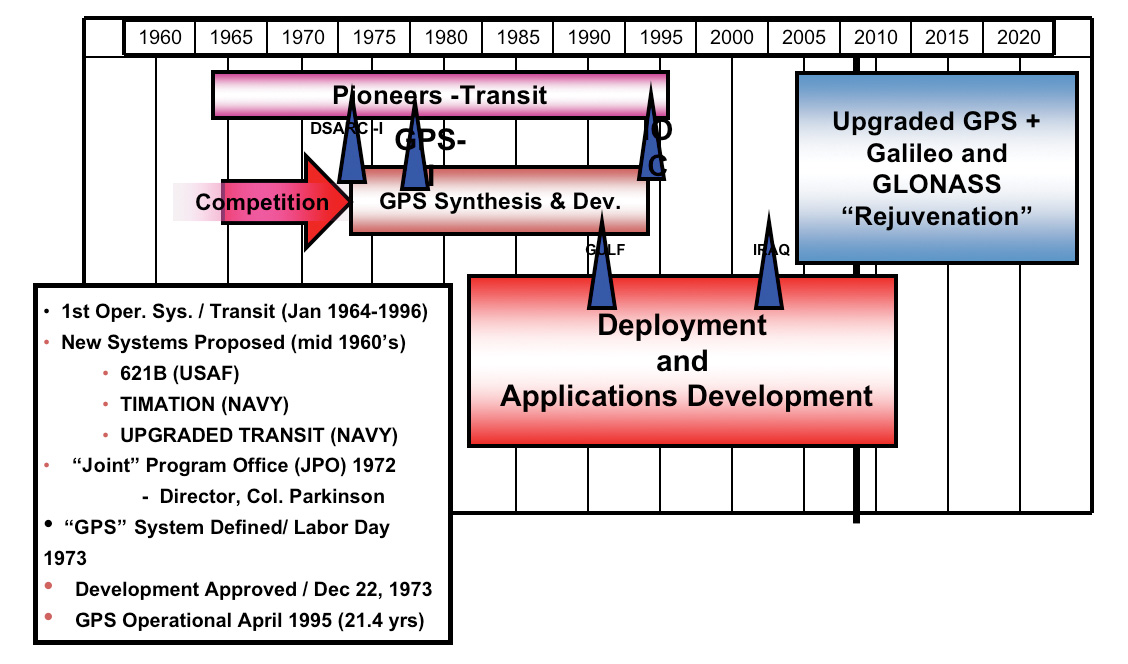 Figure 1 gives a summary view of the history of U.S. satellite-based navigation, particularly GPS. Details of the Russian GLONASS and the European Galileo systems are not included as they arrived later, and generally mimicked the GPS development albeit with their own, locally developed detailed designs.