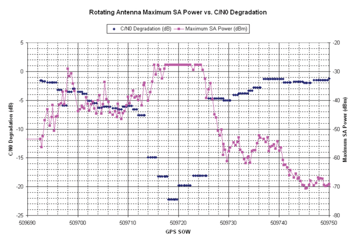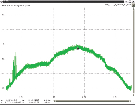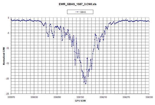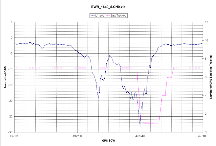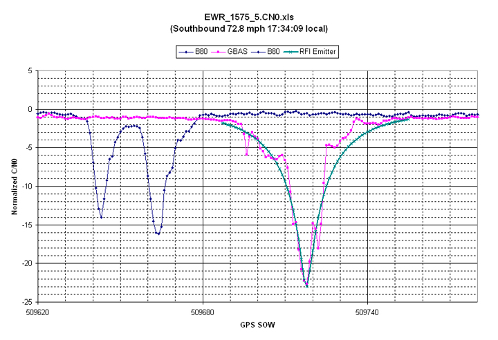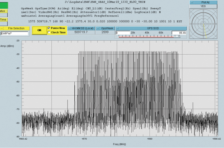 However, there also were five RFI events that spanned more than 15 MHz across L1 (Figure 1) were present as long as 20 seconds and at a power level as much as 25 dB above the receive antenna’s noise floor. Some of these RFI events were strong enough to reduce a WAAS G-II receiver C/N0 by as much as 20 dB and thereby resulted in loss of tracking for lower-elevation GPS satellites. Higher-elevation GPS satellites were able to continue tracking throughout these events but at a lower C/N0. The wideband RFI events were also detected by the SLS 4000 GBAS monitor and coincided with tracking problems in the LAAS GBAS receivers.