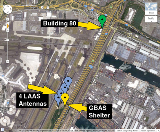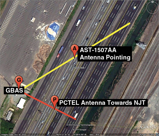 Figure 3 shows a Google map of EWR with blue dots indicating the location of the four LAAS antennas, a green dot for Building 80, and a yellow dot for the GBAS shelter. EWR is adjacent to the New Jersey Turnpike (NJT), which has seven southbound and seven northbound lanes of traffic.