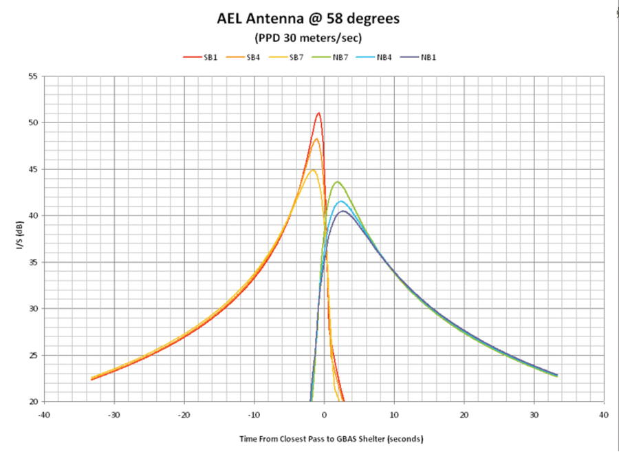Modeling of the AEL antenna took into account its pattern and orientation. It has less gain towards the south, and consequently observed power from a PPD located south of the GBAS shelter is much less. A southbound PPD will initially be within the main beam of the AEL antenna; therefore the expected interference to signal ratio (I/S) will gradually increase until it passes to the south of the GBAS shelter. Similarly, a northbound PPD will not exhibit significant I/S until north of the GBAS shelter. Figure 15 indicates that the maximum I/S occurs within 2 seconds of the point where the PPD is closest to the GBAS shelter. Typical GPS receivers can tolerate an I/S of 30 dB for CW type signals.