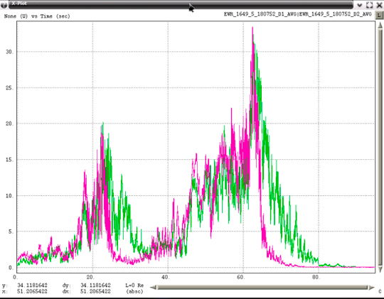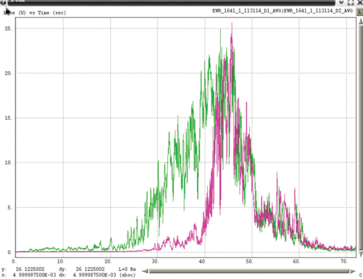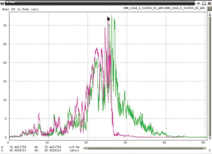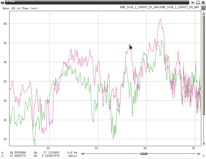 Figure 5 shows data of the first evidence of a low-power moving PPD. Data for Building 80 receiver is in blue and data from the GBAS shelter receiver in pink. Since Building 80 is north of the GBAS shelter, when degradations occurred first at Building 80, this implies that the RFI emitter is moving from north to south. Similarly, when degradations were first seen at the GBAS shelter, the RFI emitter was moving from south to north. This plot uses major time grids of 60 seconds and minor grids of 10 seconds.