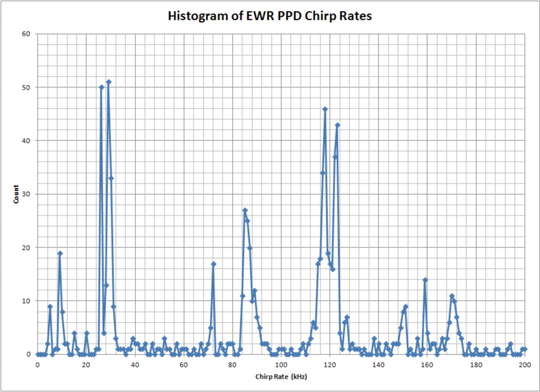 The variety of PPDs observed by the updated EWR monitoring equipment has been surprising. Within its first month of operation, more than 40 PPDs were observed with no less than 19 from unique and different PPD transmitters. Classification of PPD transmitters is based on the combination of RF spectra and the spectrum of the FM demodulated data. Although the observed PPD transmitters use a linearly swept FM sawtooth, most contain deviations from a pure linear sweep. Figure 19 shows examples of FM demodulated time series. Rather than attempting to uniquely describe the attributes of each type of deviation, it is simpler to compute the spectrum of the FM demodulated data. The fundamental frequencies of chirp rates that have been observed have spanned 9 kHz to 170 kHz. Figure 20 shows a histogram of chirp rates observed near EWR and indicates that the most frequent rates have been 9, 26, 29, 72, 85, 118, 123, 159 and 170 kHz.
