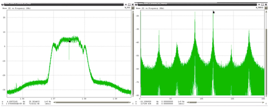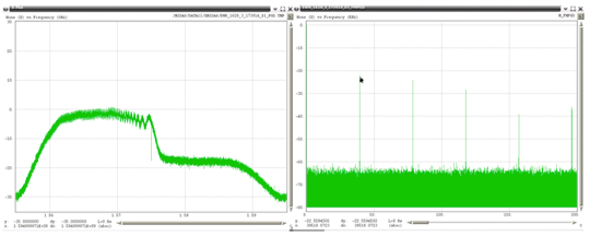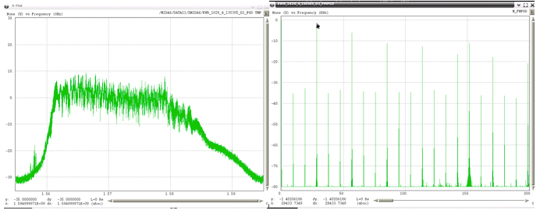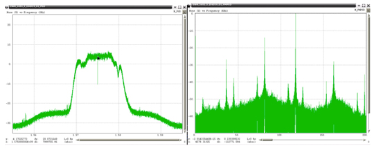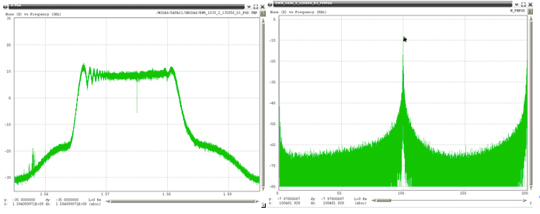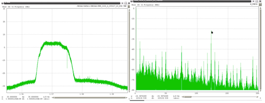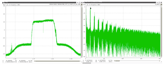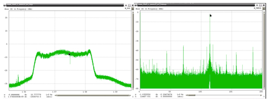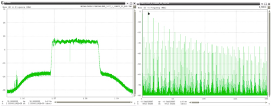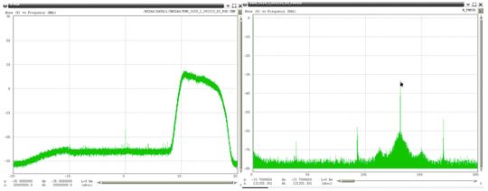 Very wide-bandwidth PPDs have recently been observed more often. The frequency span these devices are transmitting has had to be estimated due to the fact that the Snapshot monitor has 40 MHz of bandwidth, and these PPDs are transmitting beyond this bandwidth. Figure 50 through Figure 52 show examples of these types of PPDs. The left plot in these figures is the RF spectra and the right plot is the FM demodulated waveform. The latter each contain a linear component that is present for only a portion of the chirp interval. Under the assumption that the modulating waveform would be linear for the repetition interval, the slope of the visible linear component was extrapolated to the total chirp time interval. It is not possible to estimate the upper and lower frequency points for the last two examples, since neither of those had a frequency that began or ended within the observable 40 MHz bandwidth of the monitor.