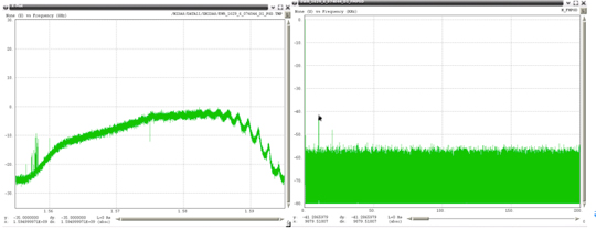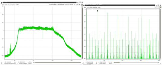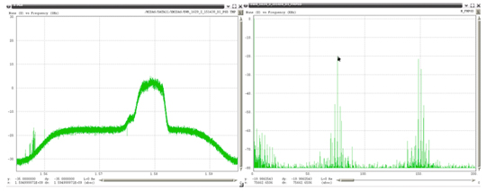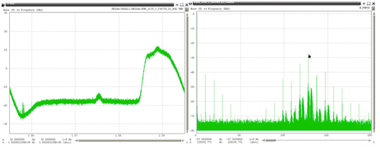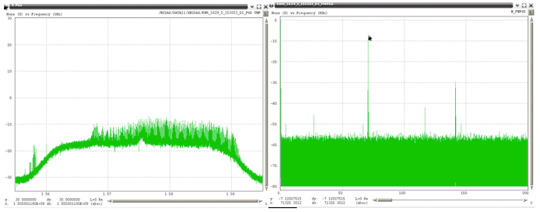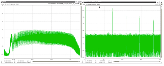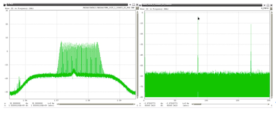 Examples of the 19 unique PPDs (detected within one month) are shown in Figure 22 through Figure 40, with the RF spectrum shown on the left, and the spectrum of the FM demodulated shown on the right. In each of these plots the scaling for the RF spectra is identical, spanning 40 MHz centered on 1575 MHz with a vertical scale using 10 dB per grid. All of the FM demodulated spectra use a horizontal axis that spans 0 to 200 kHz. For references purposes Figure 21 shows the RF spectra when no RFI is present.