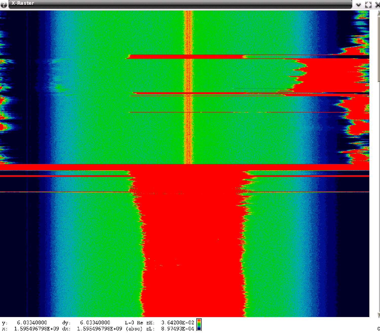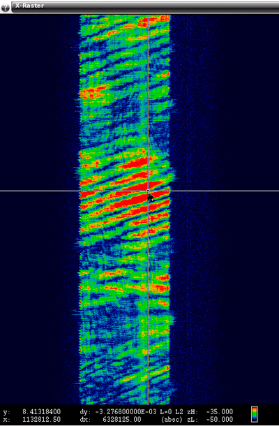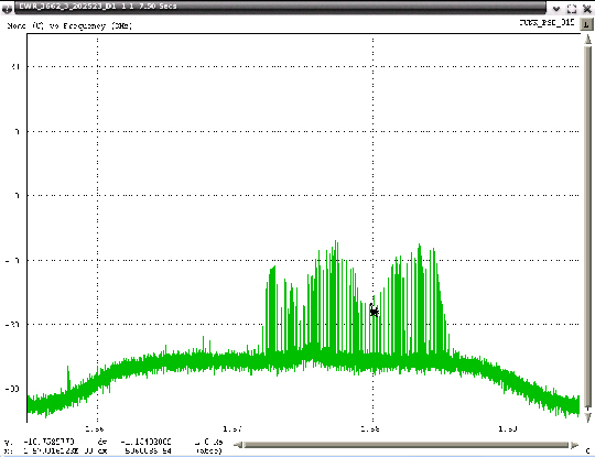 A few snapshots have also provided evidence that some of the PPDs are erratic and probably not functioning as their manufacturer intended. Figure 41 contains a raster of 6 seconds of spectral data that shows a PPD whose output was meant to be between 1560 and 1580 MHz but for short periods of time was transmitting at frequencies above 1580.