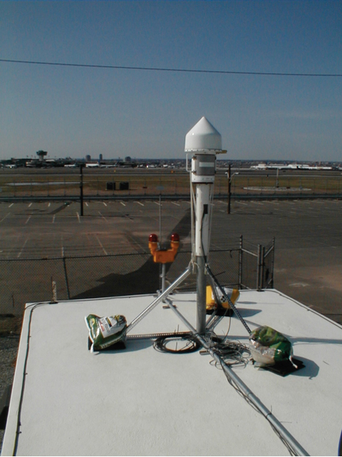 Zeta then deployed two WAAS G-II receivers separated by considerable distance (1,722 meters) to monitor for RFI, and analyze each receiver’s response only when RFI sufficient to significantly degrade GPS reception was detected. One receiver was located within Building 80, and the second receiver within the GBAS shelter near the LAAS antennas. This configuration was designed to determine degradation relative to each reference receiver and thereby establish probable search areas for the RFI emitter. The Zeta equipment also incorporated a rotating directional antenna (at the GBAS shelter shown in Figure 4) that was commanded to rotate only when significant RFI was detected.