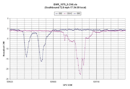 Most of the observed RFI events last for no more than 50 seconds although a few that lasted much longer have been correlated with slow traffic on the NJT. Figure 49 is from June of 2010, before the updated monitoring equipment was in place, and displays normalized degradation of C/N0. The time duration for which this RFI was observed was more than 3 minutes and was during a time when traffic was ‘slow’ on the NJT.