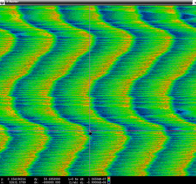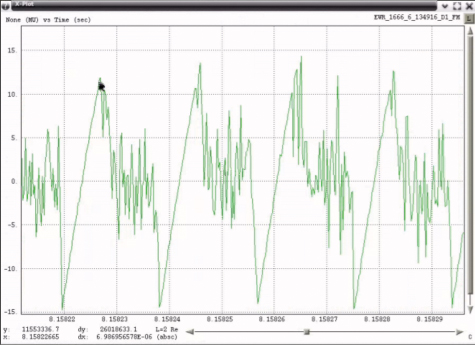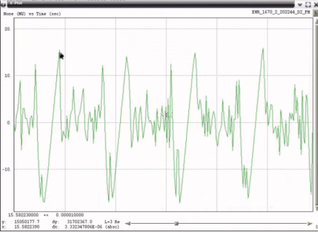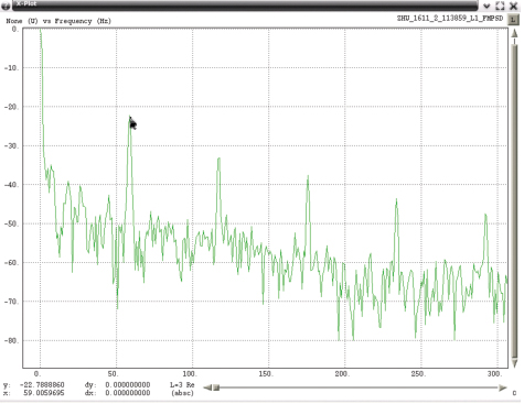 Data captured by a Snapshot System operating near ZHU contains evidence that external energy may have coupled into that PPD and affected the modulation waveform. Figure 53 shows a plot of the RF spectra and an expanded portion of the FM demodulated spectra indicating the presence of a 58.7 Hz component. A raster of the demodulated FM, shown in Figure 54, highlights the 58.7 Hertz component.