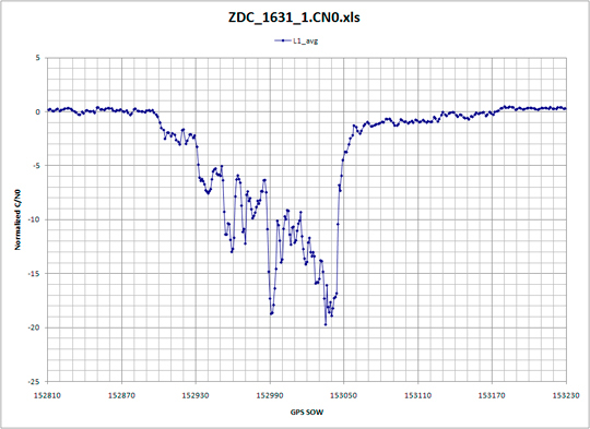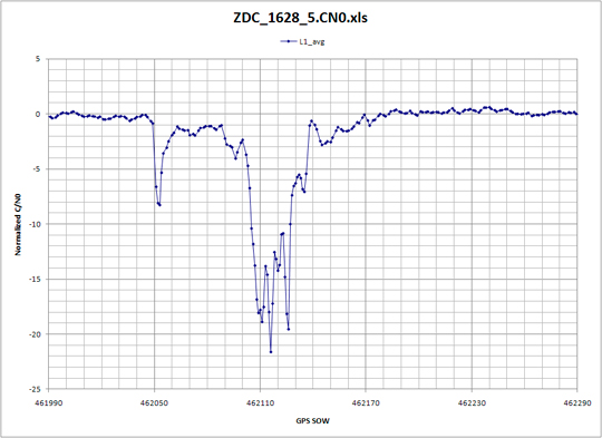 Receiver data logs were processed specifically for degradation in normalized C/N0. Normalized C/N0 was only computed for those satellites above 20 degrees, and all of those results were averaged together. Prior knowledge regarding WAAS PCTEL antennas has established an expected C/N0 versus satellite elevation that is accurate to approximately ±1 dB with a nominal mean of 0 dB. This normalized C/N0 represents an average of all satellites in view. However, individual satellite signal strength can vary greater than ± 1 dB. Significant deviations of more than –3 dB are indicative of strong RFI within the GPS processing band. Normalized C/N0 was plotted for each day that data was collected, followed by expanding those time periods where significant degradation was present.