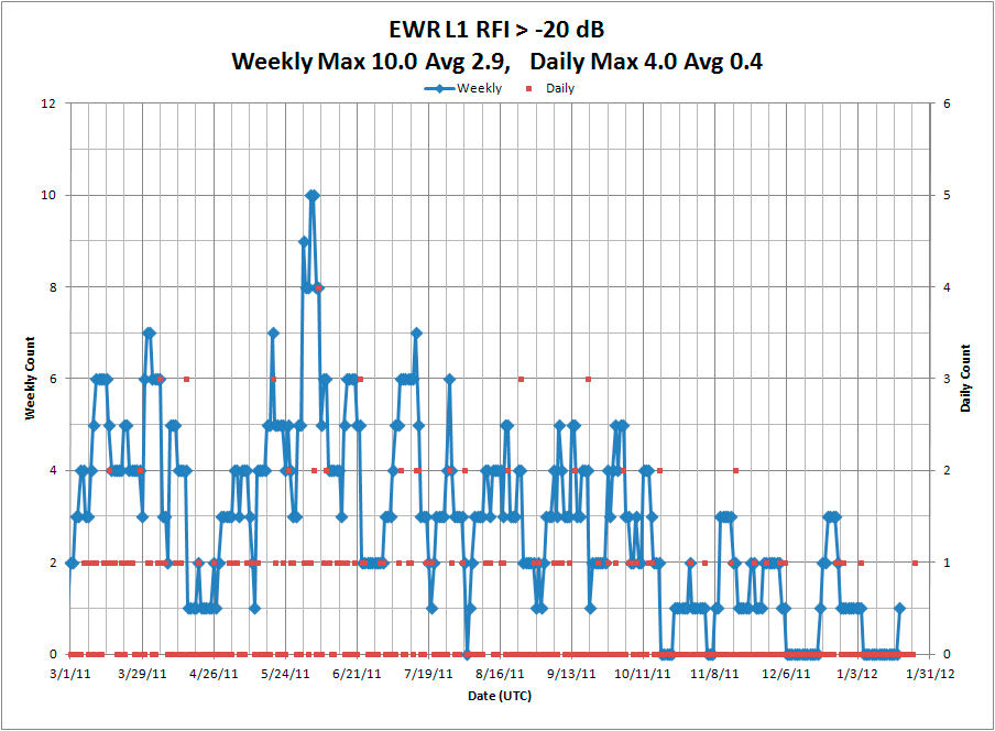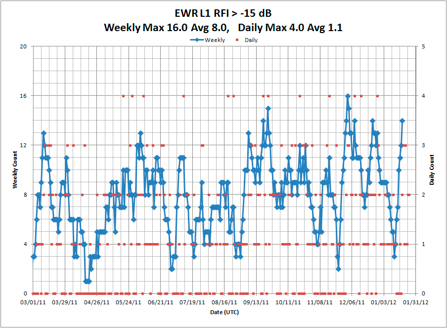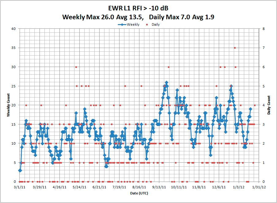 A large number of RFI events have been detected at EWR since the updated Snapshot System was installed on March 3, 2011. These RFI events have been ranked according to the magnitude of degradation in normalized C/N0, as reported by the GBAS shelter WAAS receiver. The following plots show the total number of RFI events per day (red dots) and for every seven consecutive days (blue line). On average, PPD-induced receiver degradation of at least 10 dB has been observed two times a day. Although a small number of narrowband RFI events produced receiver degradation of as much as 10 dB, the vast majority of RFI events causing 10 dB or more of receiver degradation are due to PPDs.