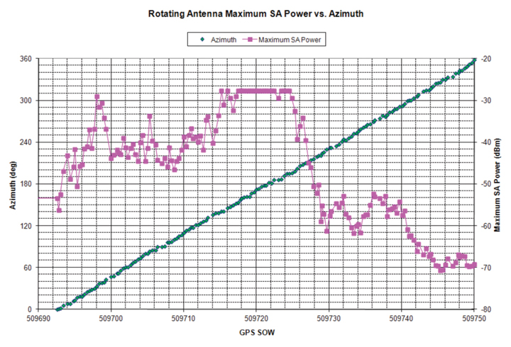 When the GBAS shelter receiver at first detected RFI, the reflector began rotating from an azimuth of 0 degrees in a clockwise direction. At the same time, a spectrum analyzer began capturing spectra at a rate of 3 per second. The first spectral maximum was observed at an azimuth of 30 degrees, a direction in which the antenna was pointed towards the NJT, to a location approximately 900 meters away from the GBAS shelter. The next time spectra were at high levels occurred for azimuths between 145 to 195 degrees, or southeast of the GBAS shelter. The approach of using a rotating antenna was originally intended to provide a direction towards a stationary source and not to track a moving emitter. However, it appears that to some extent, the rotating antenna in fact did track a moving emitter from north to south.