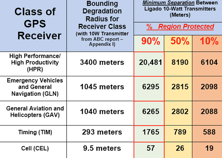 “We believe avoiding degradation over at least 90 percent of the region near Ligado transmitters is the absolute minimum protection for GPS receivers in each class. This would be a hypothetical 90 percent Protection Evaluation. This is not an endorsement of this level since, of course, all users would prefer 100 percent protection. The Department of Transportation (DOT) Adjacent Band Compatibility (ABC) study is the only validated test to verify degradation at various received power levels.
