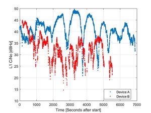 However, the devices show significantly different tracking performance: device B reports over 10 dB lower C/NO for much of the test and eventually stops reporting measurements. During our analysis, around six different Android devices have been tested; it isn’t clear whether the devices tested are typical over a broader population of device types.