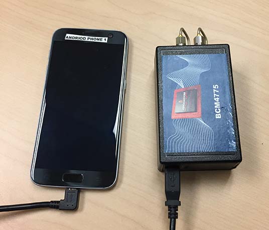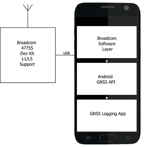 The development environment included the GNSS chipset with an external antenna port so both a cell-phone equivalent antenna and a precision antenna could be compared. This allowed us to evaluate the impact of the antenna performance on the GNSS observables and positioning results. The Broadcom GNSS development system communicates via USB to a Samsung S7 phone and publishes data via the Android GNSS measurement API so the equivalent data flow of an integrated cellular device is maintained (see Figure 10).