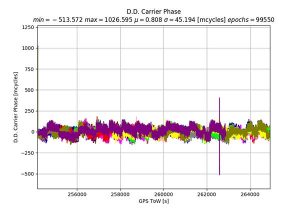 One of the devices tested was a Samsung S7 device. It provides pseudorange, Doppler and phase via the GNSS measurement API. However, the phone implements power duty cycling so after a short period of operation the duty cycling mode was enabled which resulted in a cycle slip on the phase every epoch.