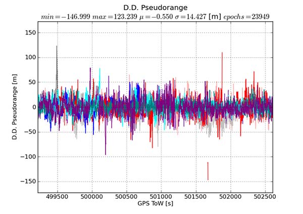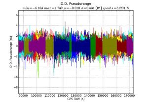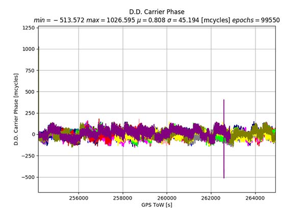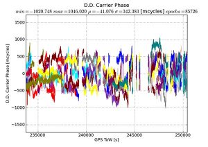 The y-axis is in millicycles (1,000 millicycles = 1 cycle or approximately 19 cm for L1 GPS). Jumps are seen as the reference satellite changes or when the measurements have cycle slips. In this case the standard deviation is 342 millicycles. A double difference residual on a precision receiver in a similar environment with a high-quality antenna on a short baseline is an order of magnitude lower than this.