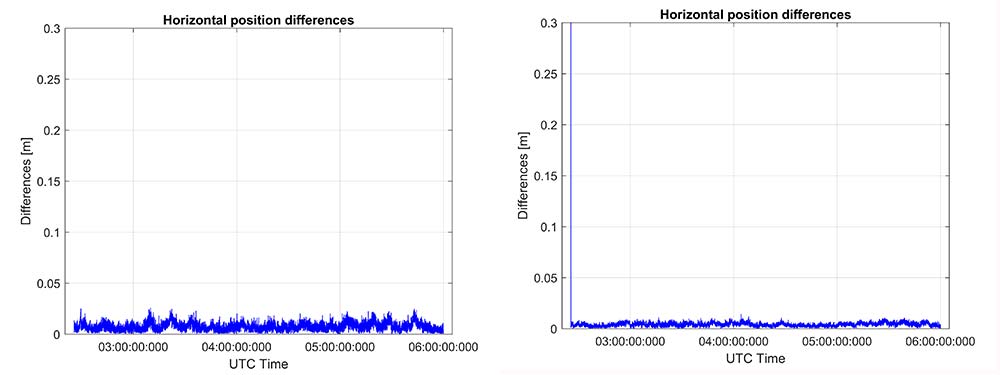 For comparison, the same metric was generated between two precision GNSS units connected to antennas on the same roof. While the data was not from the same time period, we observe very consistent performance over time.