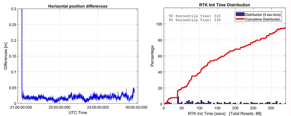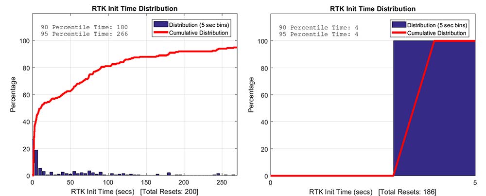Convergence times were measured with post-processing tools by splitting the datasets into individual time spans. Figure 15 shows that the consumer GNSS chipset is able to get fixed ambiguity solutions but it takes considerably more time (266 seconds versus 4 seconds) for the 95% of initializations. However, the system is fixing ambiguities and provides centimeter level positioning.