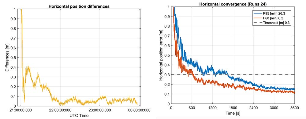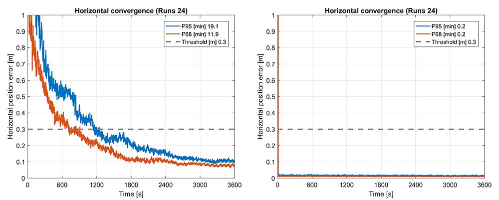 The RTX-Fast solution for Broadcom reaches 30 cm horizontal error in 68% of the cases in approximately 12 minutes. The RTX-Fast convergence using precision GNSS data is near instantaneous as can be seen in the right of Figures 16 and 17, reaching centimeter accuracy.