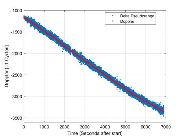 In this simple analysis measurements from a single high elevation satellite were analyzed. The Doppler is plotted along with the differenced pseudorange converted into L1 cycles. It can be seen that as expected the Doppler has much lower noise and so can be used in a pseudorange smoother.