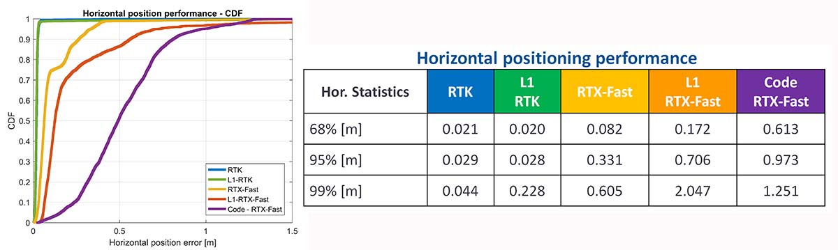 Measurements from GPS L1/L5, Galileo L1/E5A, GLONASS L1 and BeiDou B1 were logged and analyzed. The Precise Positioning Engine (PPE) allows performing carrier-phase RTX and RTK and a pseudorange-based solution using the RTX corrections. Tests were performed by using a precision antenna and a cell-phone equivalent GNSS antenna.