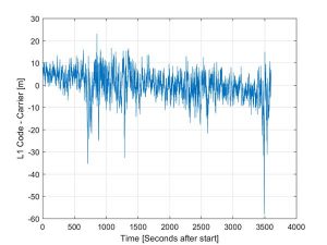 A simple way to view the pseudorange noise is to subtract the carrier phase from the pseudorange. If there are no cycle slips this should show ionospheric divergence with the noise dominated by the pseudorange noise. The absolute level is arbitrary as it includes integer carrier cycles. Figure 3 shows an example from an Android device.