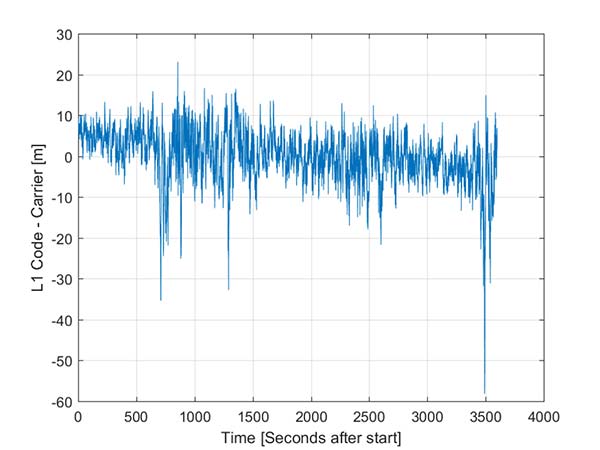 The data was captured on a building roof in an open environment. There’s a slight downward trend due to the ionospheric divergence between code and carrier, but the metric is dominated by the pseudorange noise. For this example from a high elevation GPS satellite the standard deviation is 6.5 meters. For comparison, a precision receiver connected to a precision GNSS antenna providing unsmoothed pseudorange in this environment would have a standard deviation of a few decimeters.