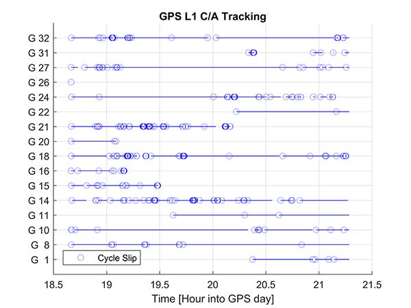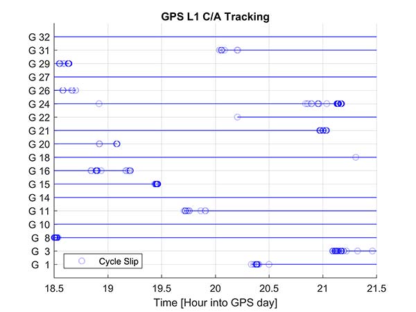 Another useful metric to review are the number of reported cycle slips. Figures 8 and 9 show a comparison of the cycle slips reported on GPS L1 C/A from an Android device compared to data logged on a precision receiver over the same time span. The receiver tends to only cycle slip at low elevation; the device had a zero-degree mask. The Android GNSS device cycle slips at higher elevations, probably a result of deep multipath fades due to the poorer antenna.