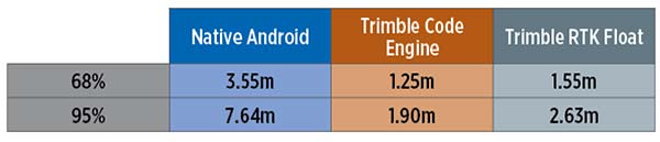 Data was processed from a Nexus 9 tablet, the only known Android device that has GNSS power duty cycling disabled. The unit was unmodified and so the Android tablet’s integrated GNSS antennas were used. The 2D performance is given in Table 1.