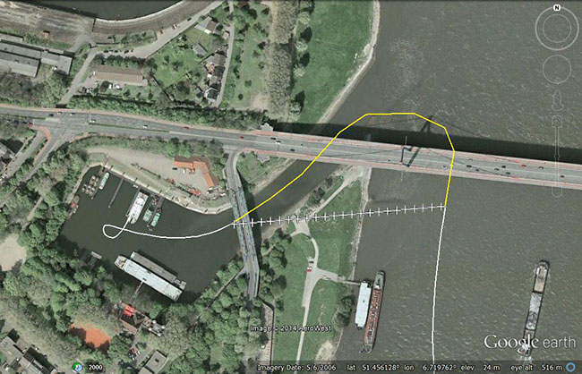 The layout of the first trajectory, which was observed for more than three hours, is presented in Figure 3. The measurements started from the inner harbour in Duisburg. The left figure shows the overview layout, and the right figure illustrates a zoom-in of the trajectory below two bridges. The white line refers to the kinematic PPP trajectory; the cross-hatched white line shows interpolated points between two solved points from the PPP solution. Because of loss of GNSS signals from the bridges, the yellow line indicates the actual vessel trajectory below bridges.
