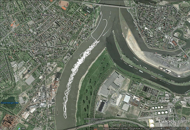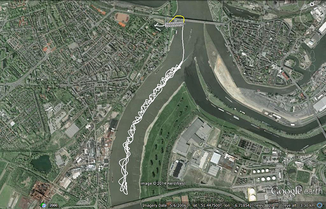 Experimental Work. Two kinematic trajectories were observed on the Rhine River in Duisburg, Germany, as a part of the project “HydrOs — Integrated Hydrographical Positioning System.” The project was launched in cooperation with Department M5 (Geodesy) of the German Federal Institute of Hydrology (BfG) and the Institute of Engineering Geodesy at the University of Stuttgart (IIGS) .
