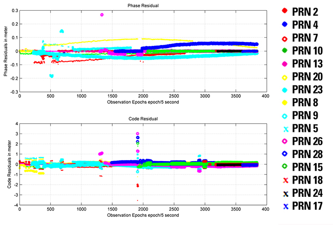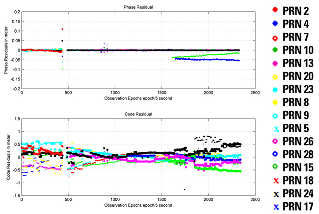 In Figure 7, the phase and code residuals are plotted. Some outliers are reported in this graph, which refers to cycle slips during the observations.