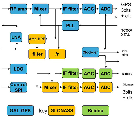 Extending the hardware to add BeiDou, which is on 1561 MHz and thus a third center frequency, meant adding another path through the IF stages of the on-chip radio. After the first mixer, GPS is at 4 MHz, and GLONASS at about 30 MHz, but BeiDou is at minus 10 MHz. While the IF strip in general is real, rather than complex (IQ), the output of the mixer and input to the first filter stage is complex, and thus can discriminate between positive frequencies (from the upper sideband) and negative ones (from the lower sideband), and this is normally used to give good image rejection. In the case of BeiDou, the filter input is modified to take the lower sideband, that is, negative frequencies, and a second mixer is not required; the IF filter is tuned to 10 MHz. The new blocks for BeiDou are shown in green in Figure 10. The baseband has no new blocks, but the code generator has been modified to generate the BeiDou codes (and, in fact, made flexible to generate many other code types and lengths). Two forms of Teseo-3 baseband are envisaged, the first being for low-cost, low-current continues to have two input paths, so must choose between GLONASS and BeiDou as required. A future high-end model may have an extra input processing path to allow use of BeiDou and GLONASS simultaneously.