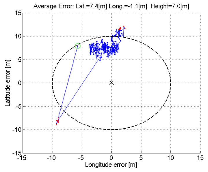 The demos were repeated in public for the press on July 24, 2013, at Fucino, Italy’s satellite earth station, with ESA/EC using the test user receiver (TUR) from Septentrio, and ST running simultaneous tests at its Italian labs. Figure 11 and Figure 12 show the position results for the data and pilot channels respectively, with independent LMS fixes. In real life, the fixes would be from a Kalman filter, and would be from a combined E1-B/E1-C channel, to take advantage of the better tracking on the pilot.