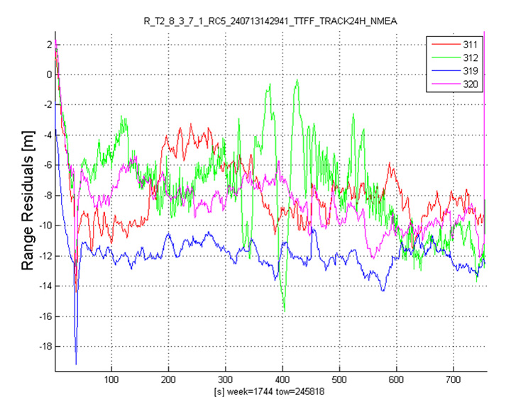 The common mode value is unimportant, representing only an offset in the receiver clock, and 10 meters is about 30 nanoseconds. The accuracy indicator is the spread between satellites, which is very respectable for a code-only receiver without full iono correction, especially around 640 on the TOW scale, where it is less than 2 meters. The rapid and major variation on the green data around t=400 is considered to be multipath, as the roof antenna is not ideally positioned with respect to other machinery and equipment also installed on the roof.