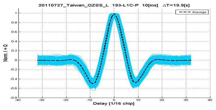 Using a long-range crystal ball and looking far into the future, a model of the future Teseo-4 DSP hardware is available, with 64 correlation taps per satellite. Running this on the captured QZSS L1-C signal gives the correlation response shown in Figure 14. Having multiple taps removes all ambiguity from the BOC signal, simultaneously removing data transitions, which can alternatively be pre-stripped using the known pilot secondary code (which on GPS III is 5 dB stronger than the data signal). The resultant plot represents 2,000 epochs, each of 10 milliseconds, plotted in blue, with integrated result for the full 20 seconds shown in the black dashed line. Assuming vehicle dynamics is taken out using carrier Doppler, this allows extremely precise measurement of the code phase, or analysis of any multipath in order to remove it. This RF data was captured on a benign site with a static antenna, so it shows little distortion.