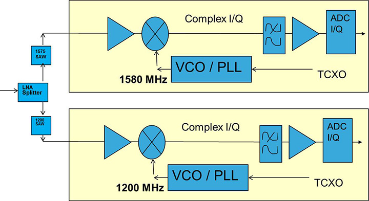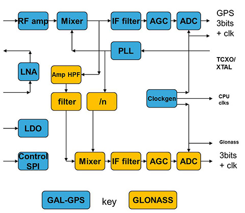 Next was the return to strength of the GLONASS constellation, meaning receivers were actually needed before Galileo. However the different center frequency (1602 MHz), and the multi-channel nature of the FDMA meant more major changes to the hardware. As shown in Figure 2 in orange, a second mixer was added, with second IF path and A/D converter.