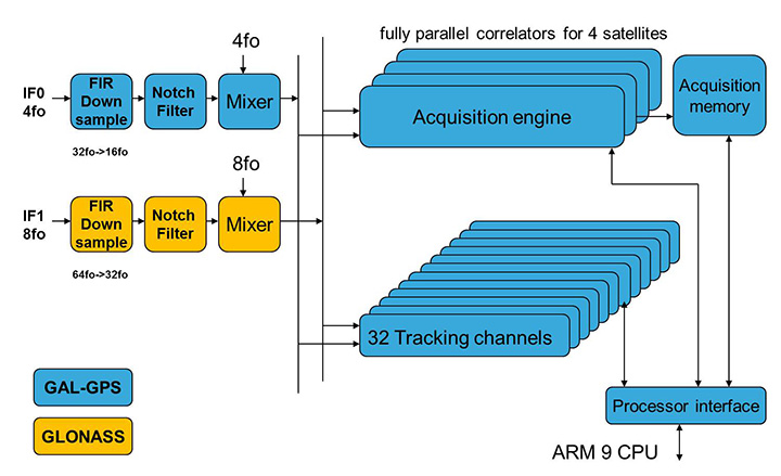 The baseband changes added a second pre-processing chain and configured all the acquisition channels and tracking channels to flexibly select either input chain. Less visible, the code-generators were modified to support 511 chip codes and 511kchips/sec rates.