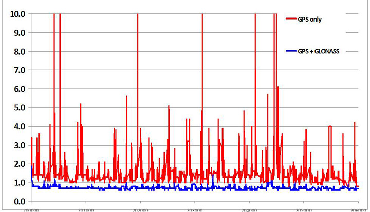 Teseo-2 appeared with GPS/GLONASS support in 2010, and demonstrated the benefit of GNSS in urban canyons, as shown by the dilution of precision (DOP) plot for central London in Figure 4. The GPS-only receiver (in red) has frequent DOP excursions beyond limits, resulting either in bad accuracy or even interrupted fix availability. In contrast, the GNSS version (in blue) has a DOP generally below 1, with a single maximum of 1.4, and thus 100 percent availability. Tracking 16 satellites, even if many are via non-line-of-sight (NLOS) reflected paths, allows sophisticated elimination of distorted measurements but still continuous, and hence accurate, positioning.